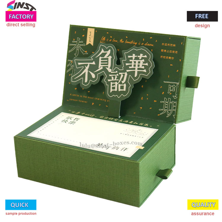 Táto darčeková krabička na parfumy, ktorú priamo predáva balenie a tlač SINST, má ako hlavný tón sviežu zelenú. Korpus zásuvkového typu je vybavený trojrozmernými umeleckými znakmi a zlatými dekoráciami. Bočná strana darčekovej krabičky na parfumy je zdobená nápismi „Shao“ a „Qi“ a vnútorná drážka na vankúši je stabilná a voňavá, čo dokazuje jemnosť. Koexistencia umeleckého zmyslu a rituálneho zmyslu je kvalitnou voľbou na sprostredkovanie emócií.