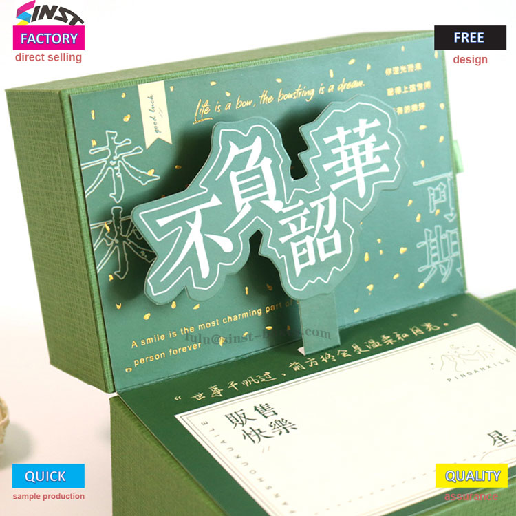 Telo tejto luxusnej darčekovej krabičky je pokryté zeleným textilným textúrovým materiálom, ktorý má jemný dotyk; Obal krabice je sústredený okolo vyhĺbených trojrozmerných postáv „Nikdy sa nevzdávaj mladosti“ obklopených malými oranžovými ozdobami. Nad slovami sú vytlačené v angličtine, ako napríklad „Úsmev je najčarovnejší“, vyjadrujú vrúcnu atmosféru a vyjadrujú pocity, ktoré prináša darčeková krabička.