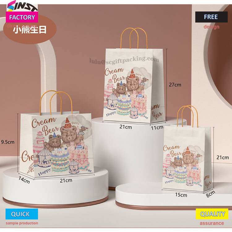 Roztomilé a zábavné balenie tejto darčekovej tašky na narodeninové dezerty rozsvieti pocit narodeninového obradu. S „Little Bear Birthday“ ako základným prvkom je taška vytlačená karikatúrnym vzorom malého medveďa, ktorý má narodeninový klobúk, obklopený klasickými narodeninovými prvkami, ako sú koláče a karusely. Slová „Happy Birthday“ sú v ňom vytlačené a taška predstavuje teplú a krásnu atmosféru ako celok, čo je tiež roztomilý nosič na sprostredkovanie požehnaní.