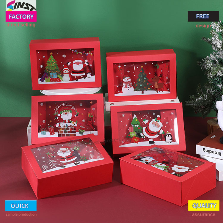 Táto vianočná bonboniéra má teplé červené pozadie, obdĺžnikové telo škatuľky a priehľadné okienko ako okno na nahliadnutie do zimnej rozprávky. Táto vianočná bonboniéra vyrobená z tvrdého papierového materiálu, ktorý dokáže vystaviť cukríky vo vnútri a má určitý stupeň stability. Dá sa prispôsobiť každodenným veciam, ako je čokoláda, zákusky, sušienky, gumičky atď.; Nie je to len roztomilá nádoba na sladkosti, ale aj stolná vianočná dekorácia. Ak ho darujete ľuďom na osobnú potrebu, môžete rozjasniť sviatočnú náladu a každá sladkosť bude zabalená v slávnostnom duchu.