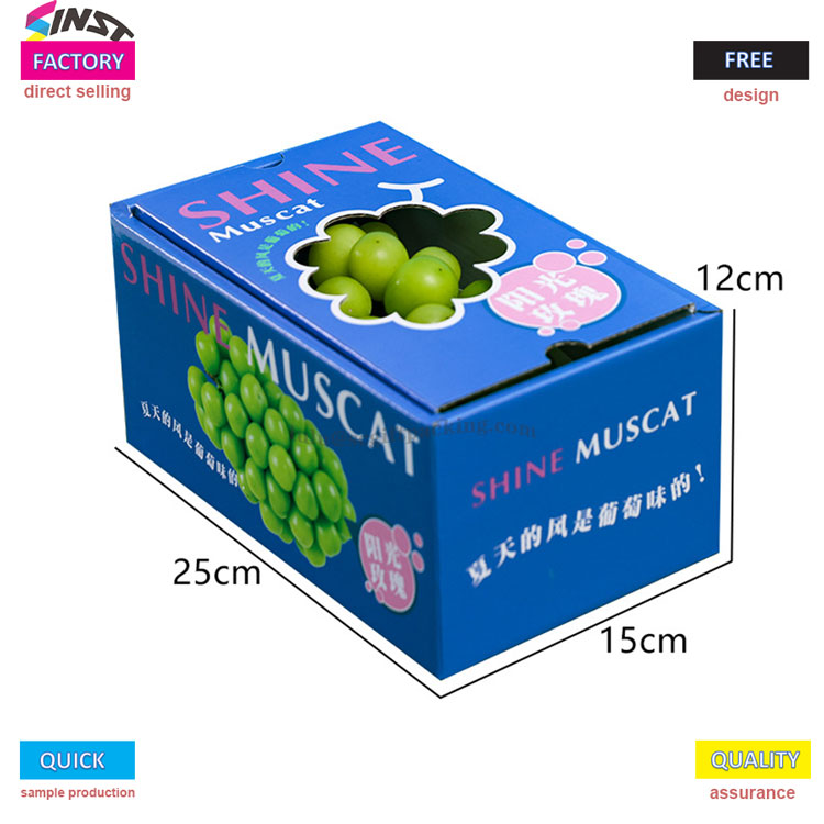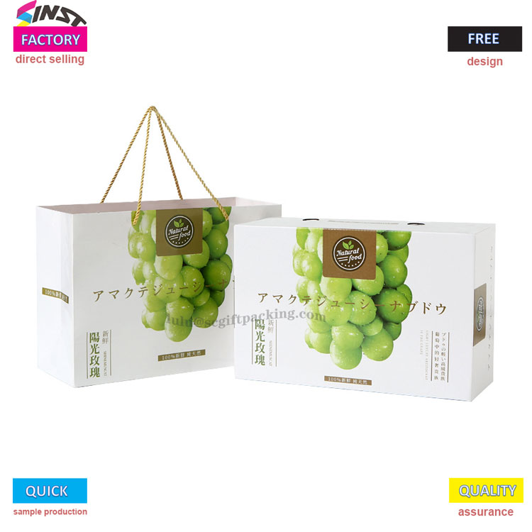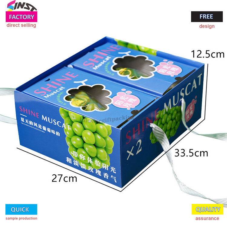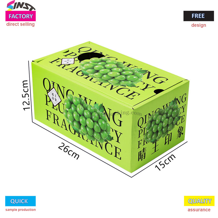 Univerzálne vreckové darčekové boxy ovocia pre hrozno je vyrobené z vystuženého kartónového materiálu s korunutovaným E-korugovaným, s jasným vzorom hrozna vytlačeného na povrchu. Je spárovaný so zeleným nosným popruhom na vrchole a logom značky vytlačeného na tele boxu, ktorý jasne sprostredkuje našu hlavnú filozofiu služieb - nie je potrebné, aby sprostredkovatelia robili cenové rozdiely a celý proces od výberu po hromadnú výrobu spravuje továreň.