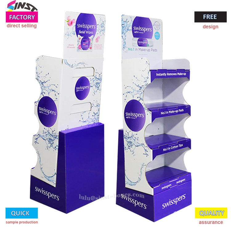 Najvýraznejšou črtou nášho stojana na mokré utieranie je vyrytie „značka na prvom mieste“ v očiach zákazníkov – predná, bočná a spodná strana sú husto vytlačené sloganom „kategória ako prvá“. Biely základ je zdobený fialovou farbou a na hornej reklamnej tabuli je nápis „Facial Wipes“ a „Instantly Remove Make up“, pričom názov značky je skrytý aj pozdĺž okraja drážky. Zákazníci na prvý pohľad vidia, že police sú zaplnené tými najprofesionálnejšími signálmi, či už ide o nákup odličovacej vaty alebo vlhčených obrúskov, cítia, že vybrať si ju je určite správna voľba. Jeho používanie v supermarketoch a kozmetických predajniach je ekvivalentom udelenia „certifikácie koruny predaja“, čo je efektívnejšie ako propagácia predajcov.